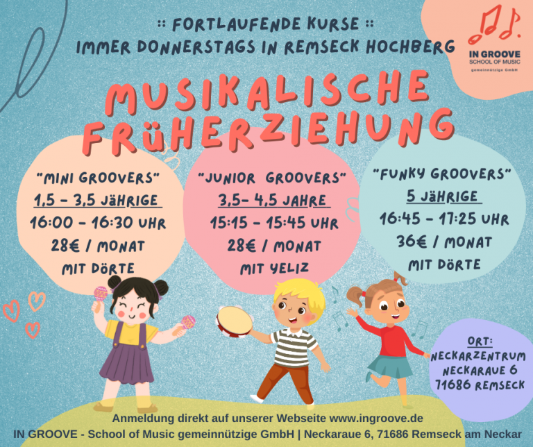Unsere musikalischen Früherziehungskurse finden ausschließlich Donnerstagnachmittag an unserem Standort in Remseck Hochberg statt. Bei Interesse gerne Probestunde vereinbaren und Platz sichern. Es werden maximial 8 Kinder pro Kurs zugelassen.